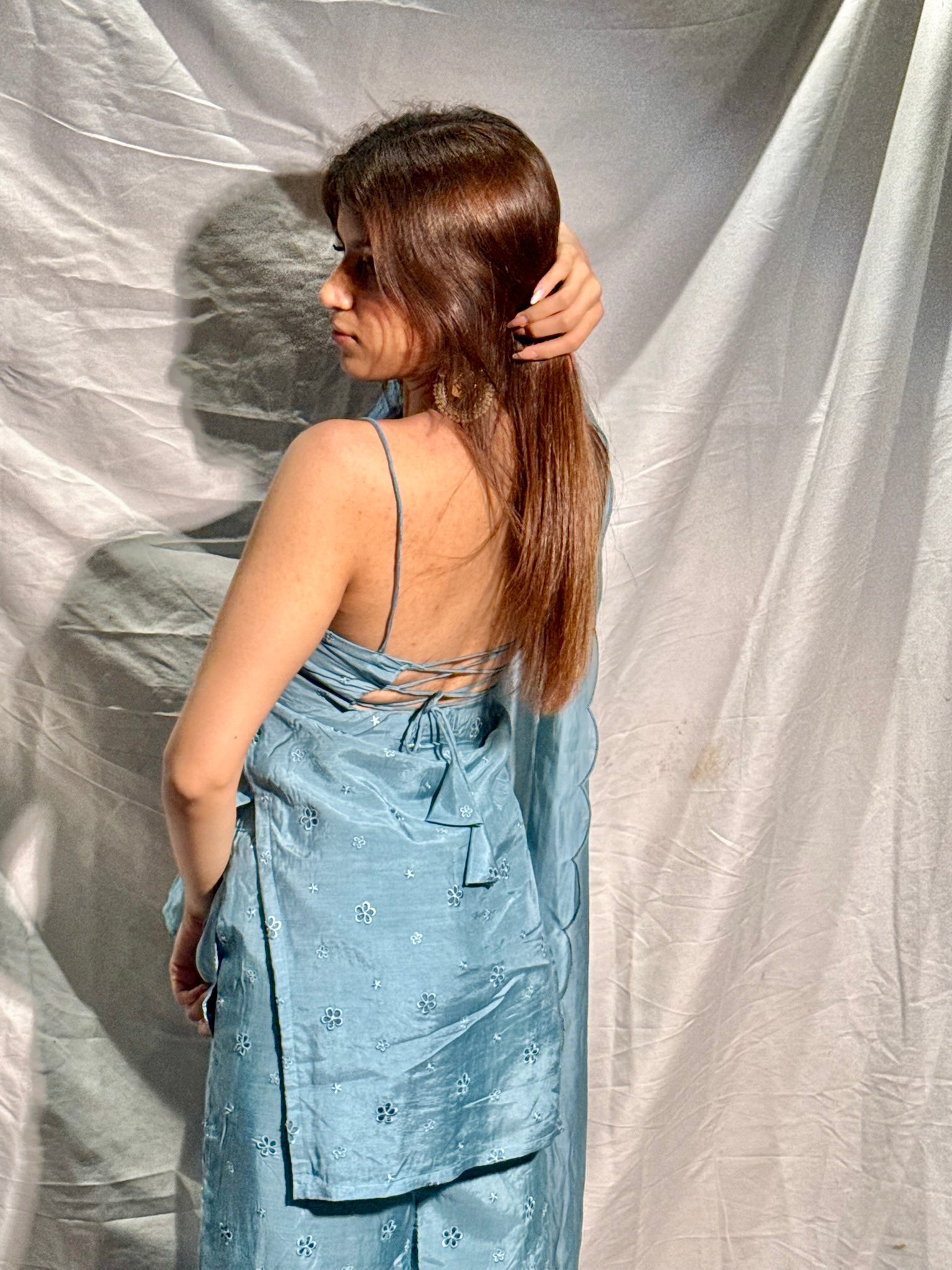 Introducing Azura — a modern masterpiece in the season’s trendiest ice blue hue. Crafted from muslin silk with delicate embroidered flowers, this ensemble is a perfect balance of elegance and contemporary style.