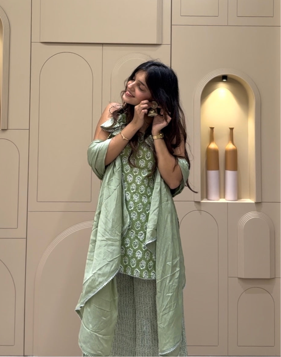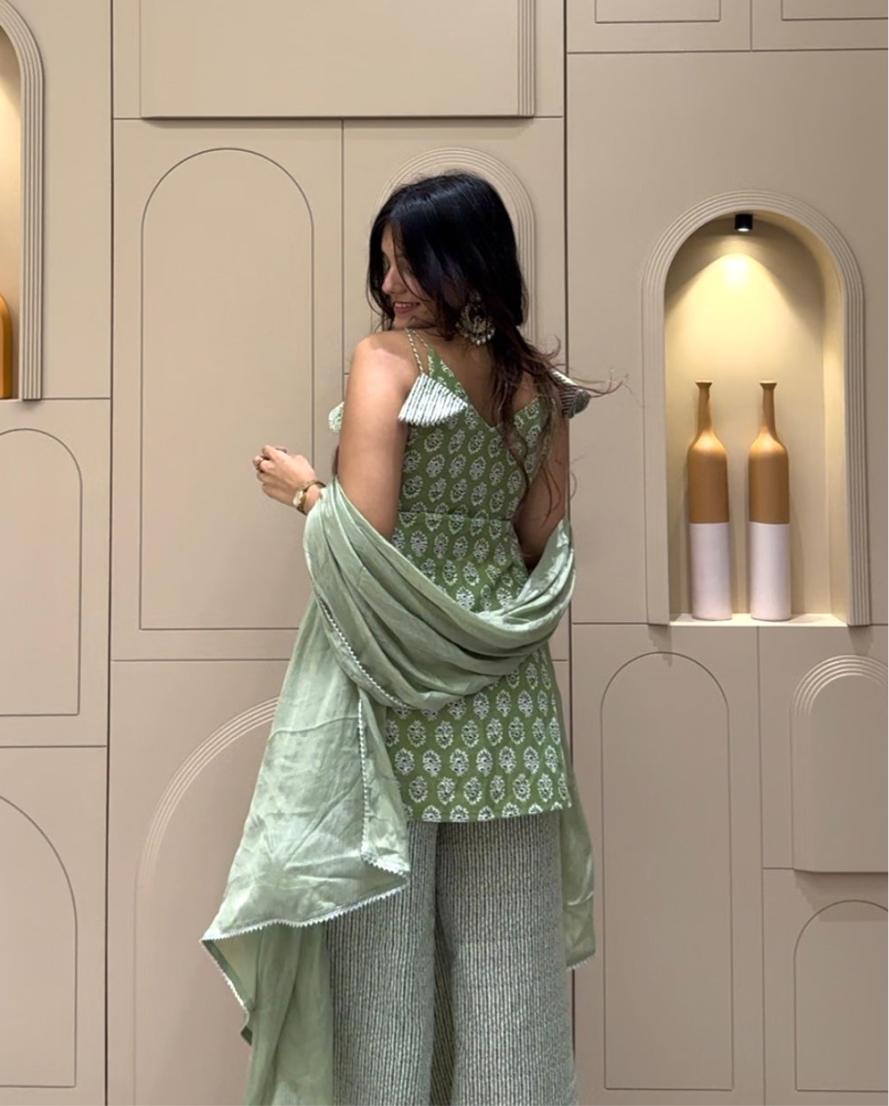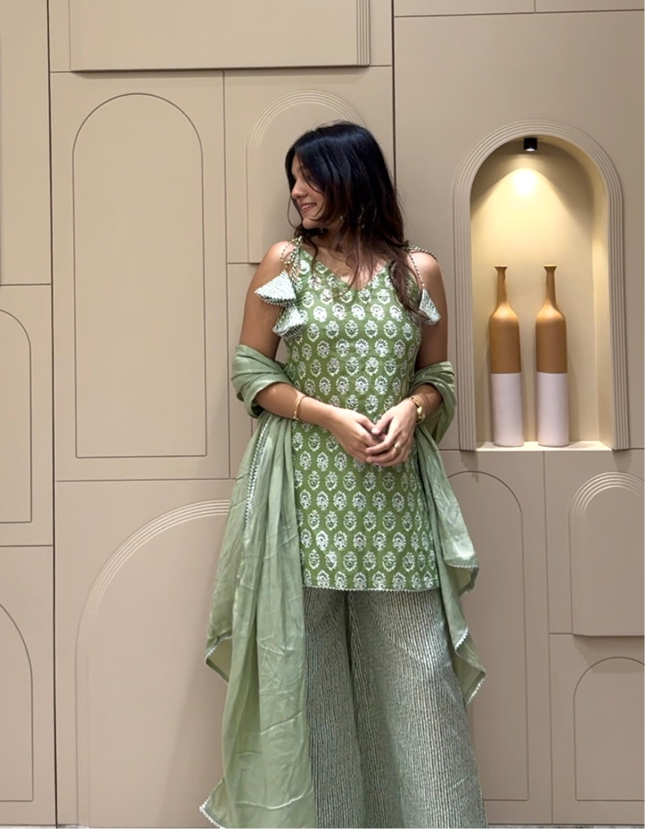 This set is designed for effortless elegance and comfort. The kurti features a stylish V neck design with tie detailing on the shoulder with charming, oversized latkans on the ties, adding a playful touch to your look. Crafted from breathable cotton, it ensures all-day comfort. Paired with flared cotton pants that have an elasticated waist for a snug fit and practical pockets, this set combines style and functionality. The luxurious Chanderi dupatta completes the ensemble, adding a touch of traditional grace with a contemporary twist. Perfect for any occasion, this kurti set blends tradition with modernity.