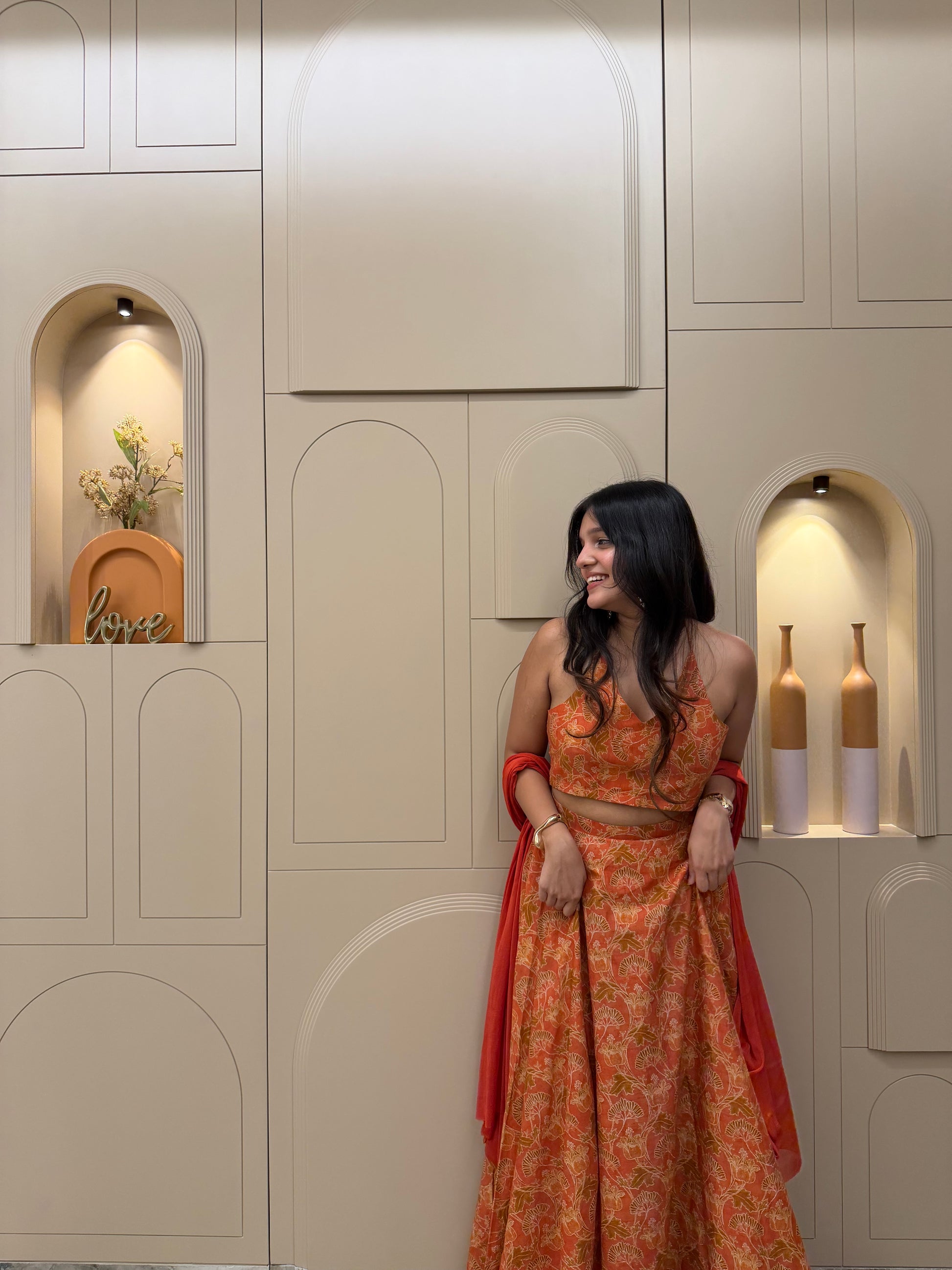 The pure cotton blouse is soft inside with a halter neck and tie back, designed for comfort through long hours of celebration. The flared skirt dances lightly with every move, while the georgette dupatta glows softly in the light, adding a sunlit charm to your look.