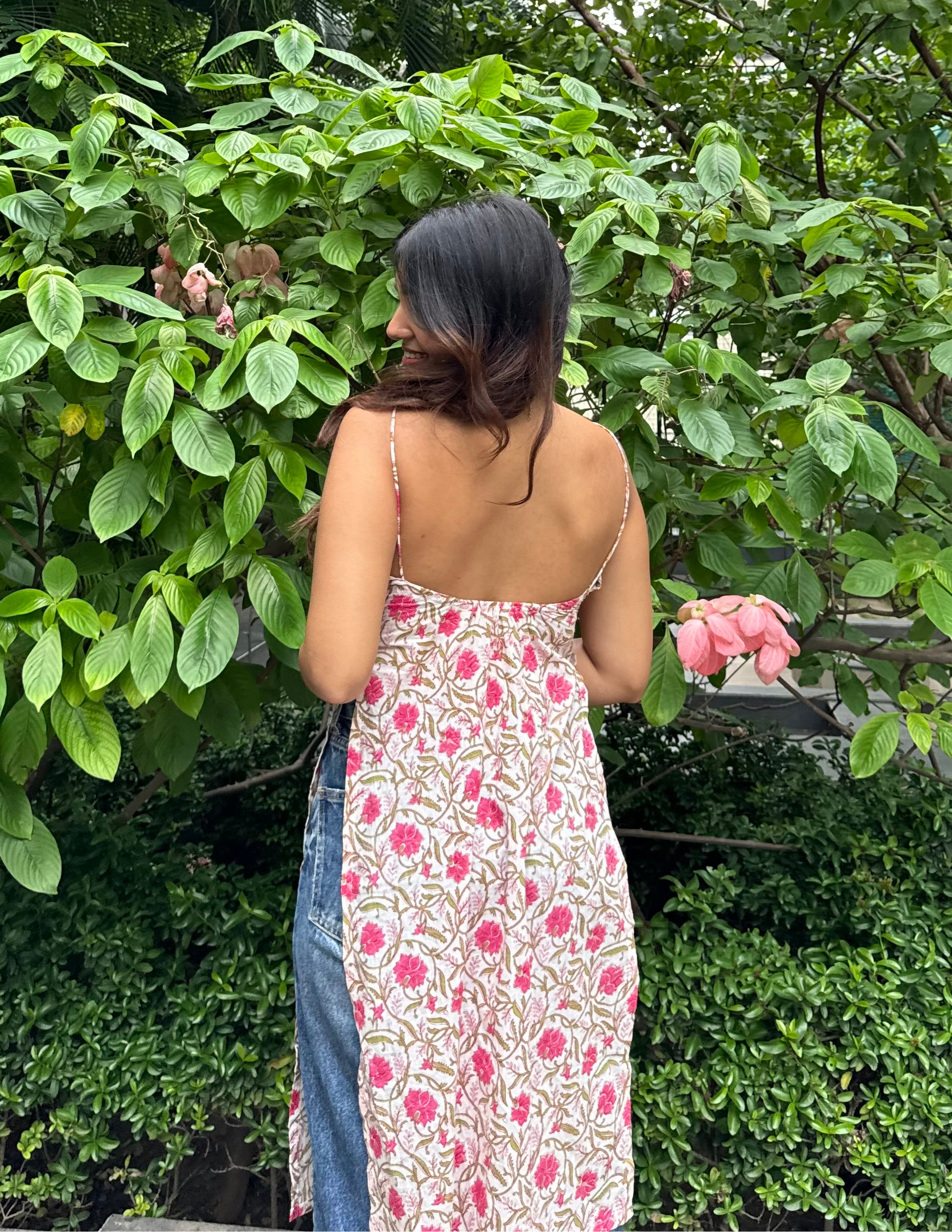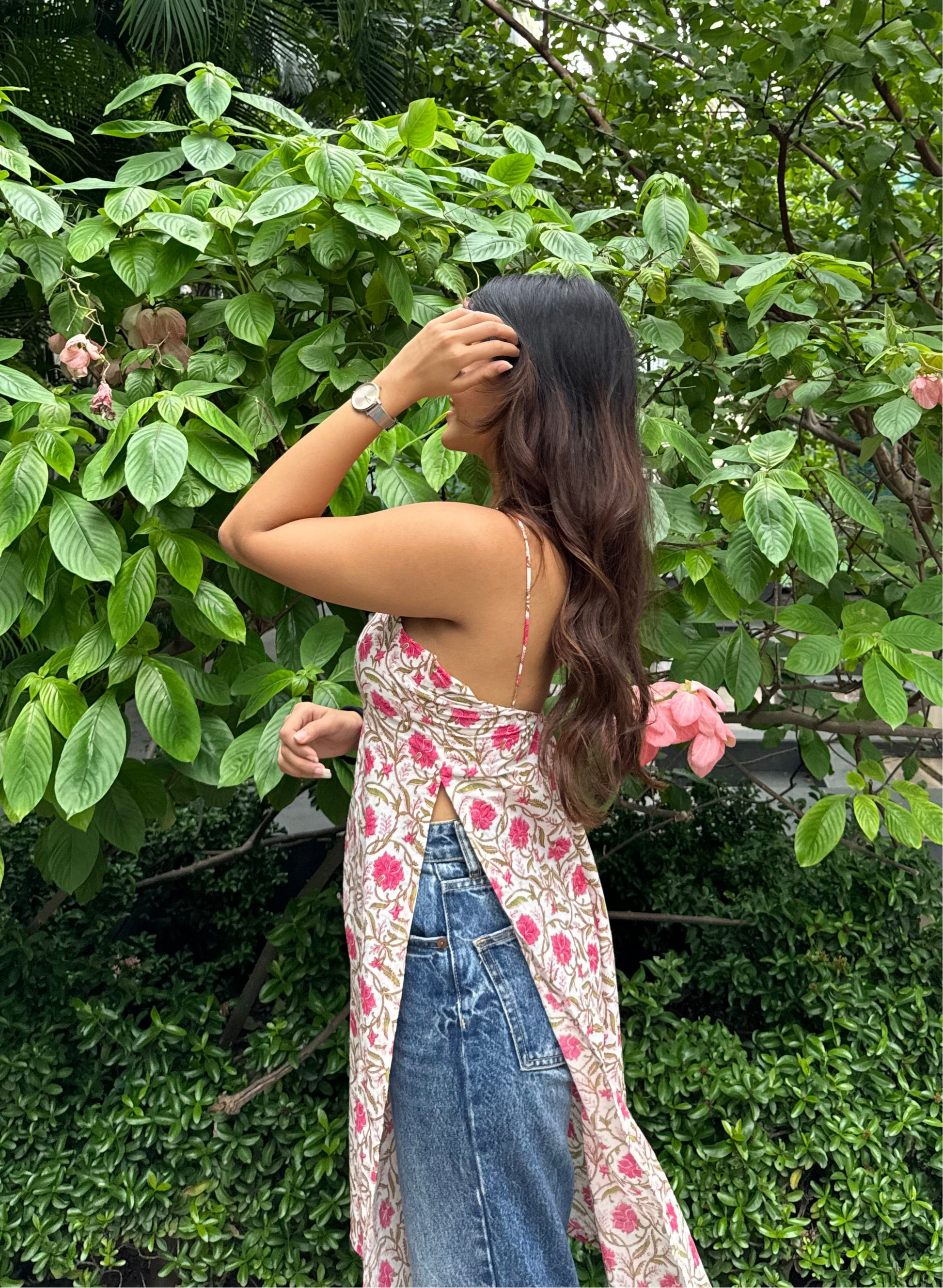 A simple yet stylish sleeveless kurti. Its elegant V neckline and a deep-cut back that adds a touch of allure. The noodle straps offer a contemporary twist, making it a perfect blend of sophistication and modern chic.