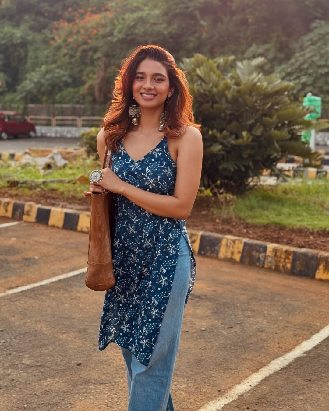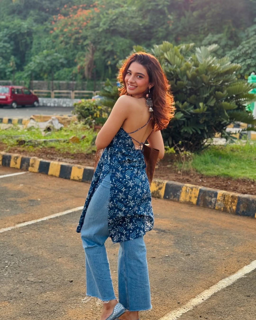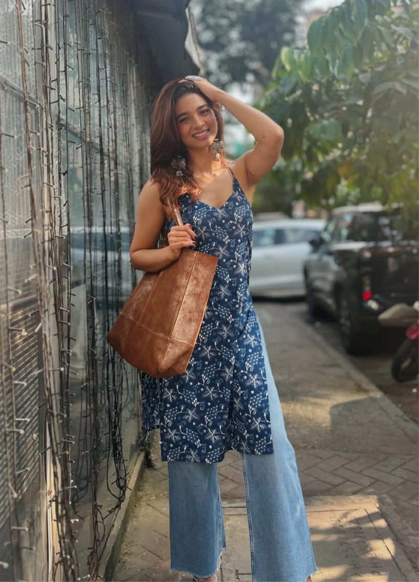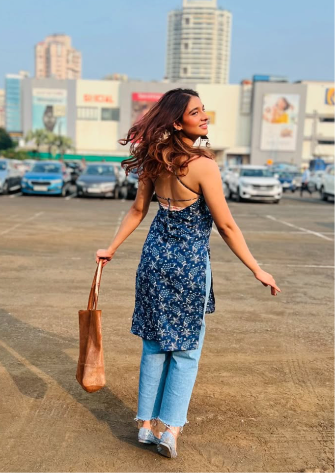 It features a flattering sweetheart neckline in the front, adding a touch of femininity and allure. The standout detail of this kurti is its backless design, highlighted by tie details that gracefully drape across the open back, offering a chic and modern twist.