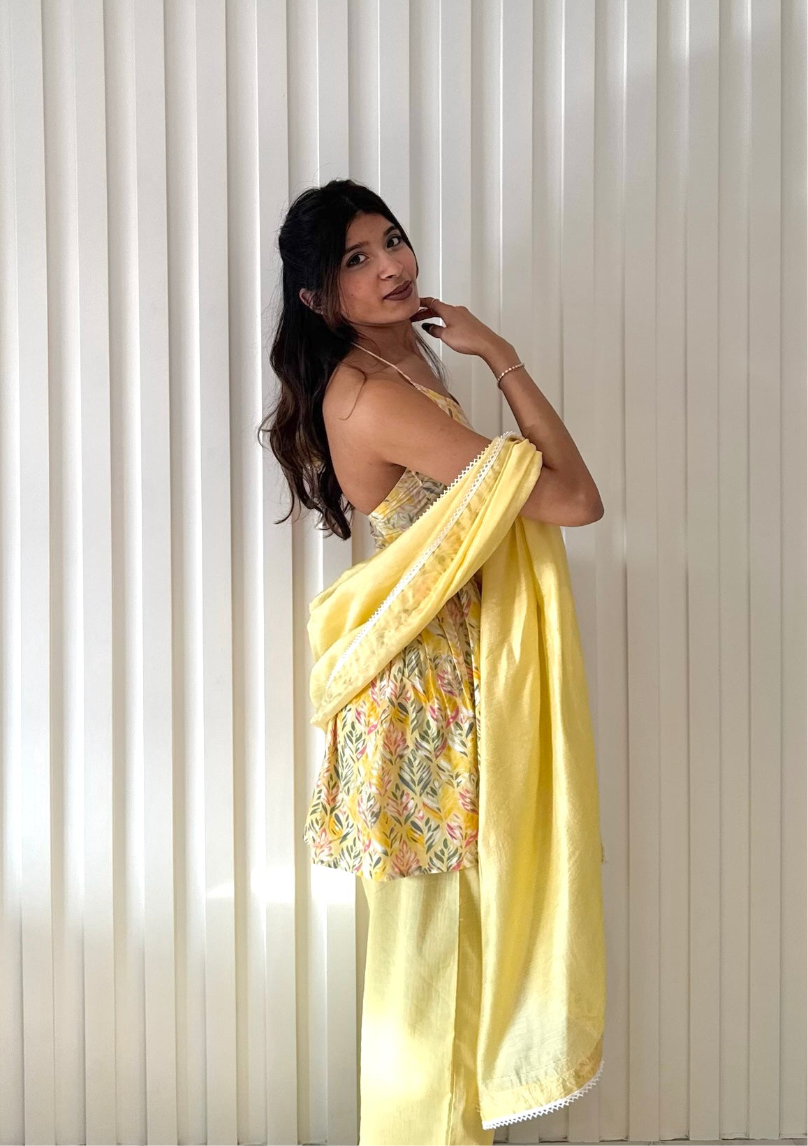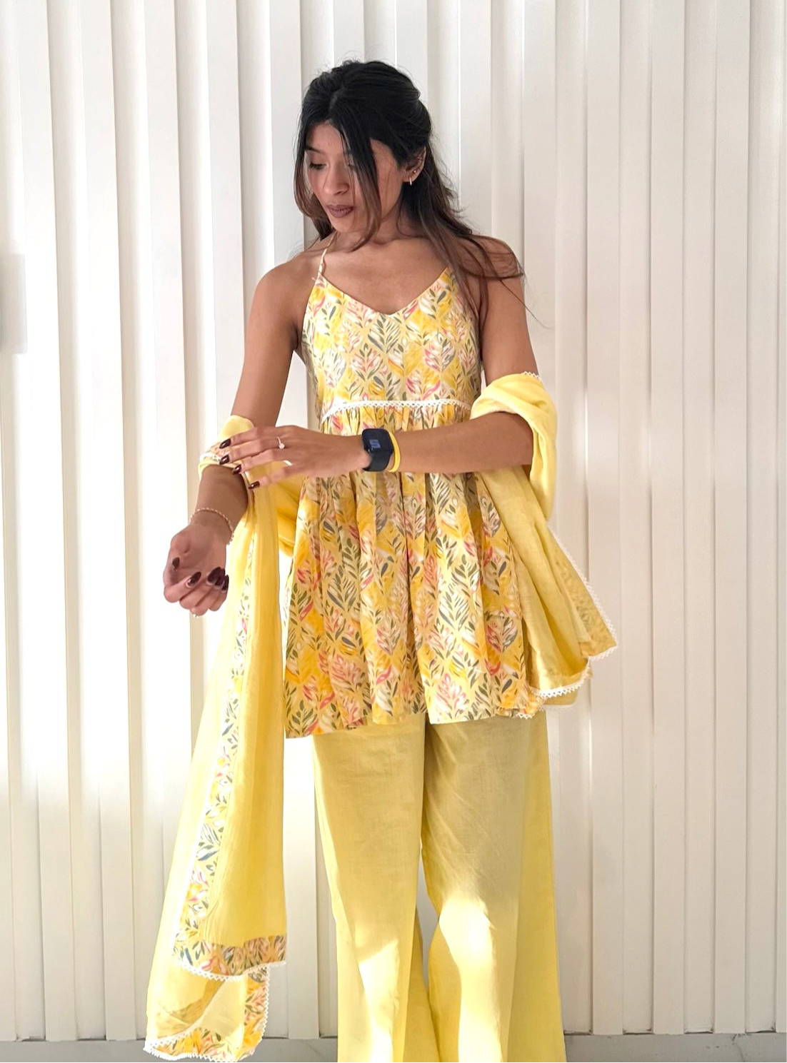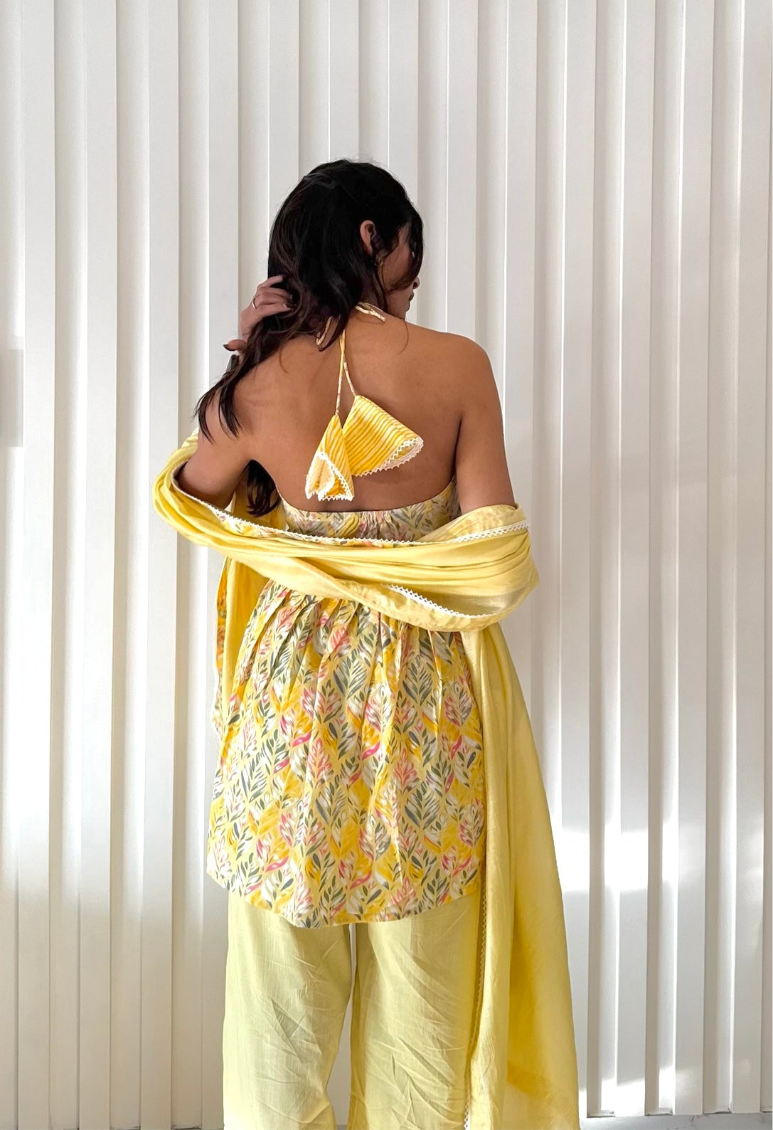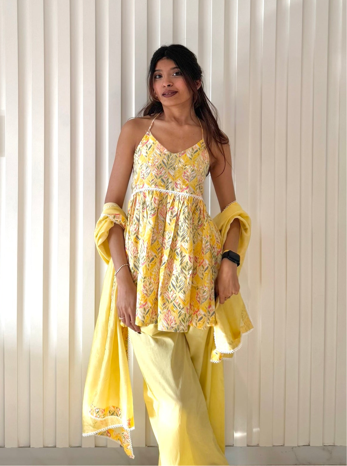 The Sunshine Arivi set is a stunning blend of modern elegance and traditional charm. It is made with pure cotton fabric. The peplum-style halter-neck top features a striking backless design, highlighted by intricate lace detailing at the center, creating a statement piece that exudes sophistication. Paired with straight-fit bottoms for a sleek and comfortable silhouette, the set is elevated further by a beautifully crafted dupatta adorned with delicate lace accents. Perfect for festive celebrations or special occasions, this ensemble captures the essence of grace and timeless style.